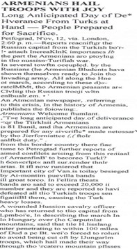 “Türk şehri Van (Erzurum’un 140 mil güney doğusunda), Ruslara yardım etmekte olan bir Ermeni birliği tarafından kuşatıldı. Şehirde yüksek sayıda askeri techizat bulunuyor. Başka bir Ermeni birliği de Türk ordusunu arkadan sardı.”